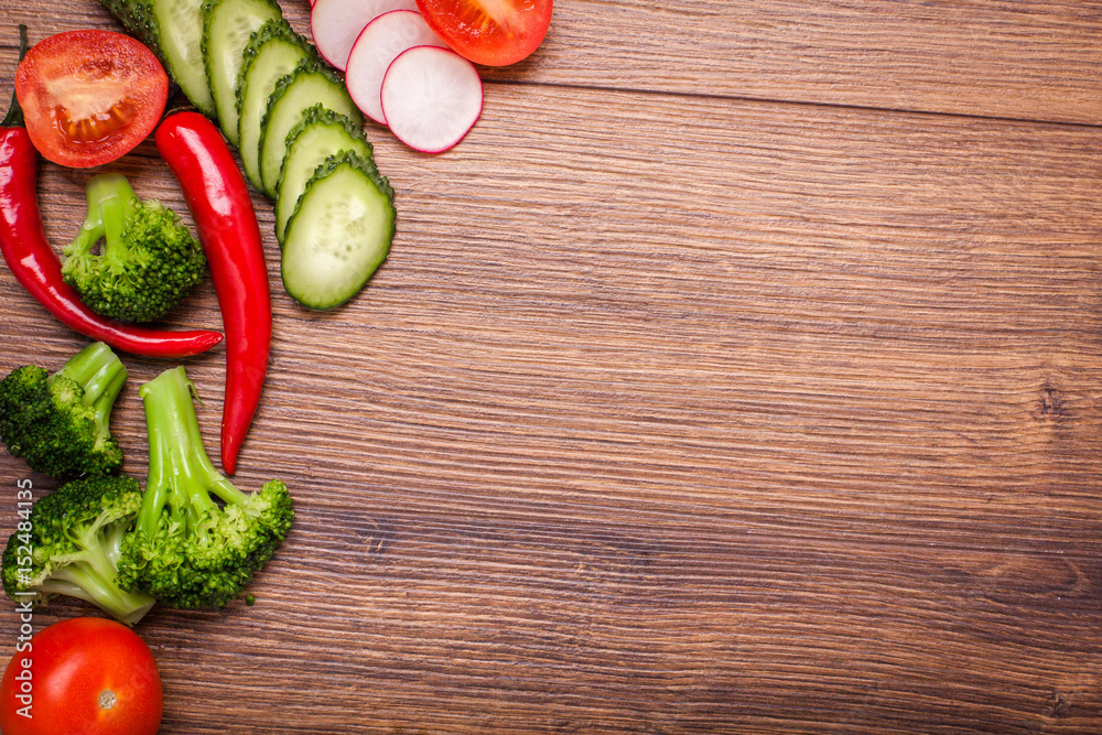 tomato, radish, cucumber, broccoli, onion, chili on a wooden surface. arrangement of sliced vegetables. Top view with copy space for text. Top view with copy space for text