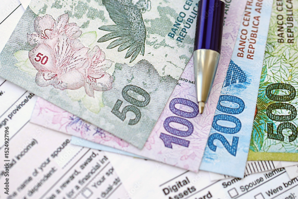 Argentine pesos money bills in big amount lies on table with pen and tax forms close up