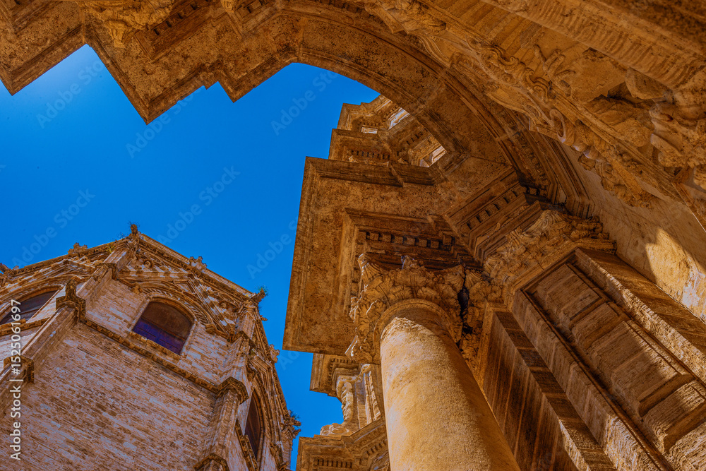 Valencia Cathedral in Spain with ancient stone walls, rustic textures, and historic Gothic and Romanesque architecture. Beautiful heritage landmark in the old town, perfect for cultural tourism, histo
