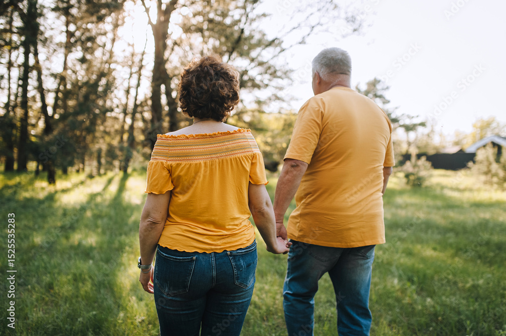 Elderly gray-haired man and adult woman walking holding hands in the forest on green grass outdoors. Photography, portrait.