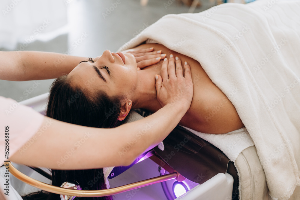 Scalp spa treatment with long dark hair on spa couch, professional hair therapy session