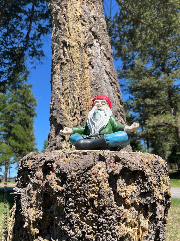 Peaceful Garden Gnome Meditating on Tree Stump in Natural Forest Setting
