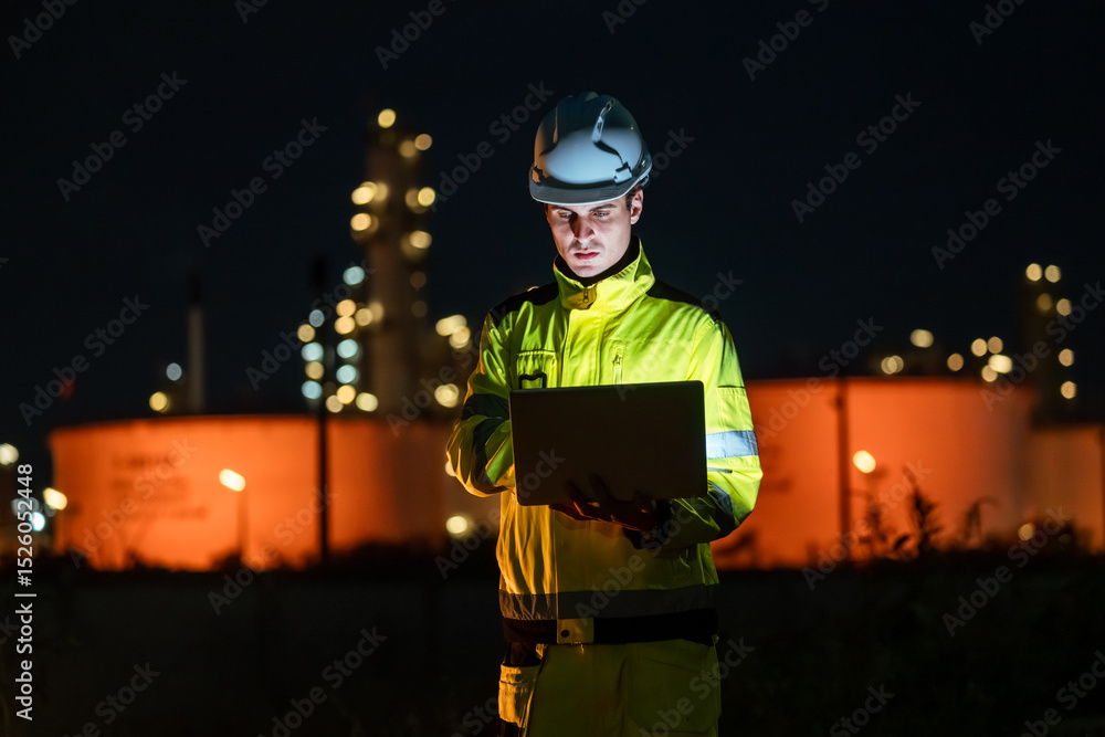 Factory worker engineer man using laptop computer for system maintenance at outdoor refinery site during night shift, working in industrial environment with focus and precision.