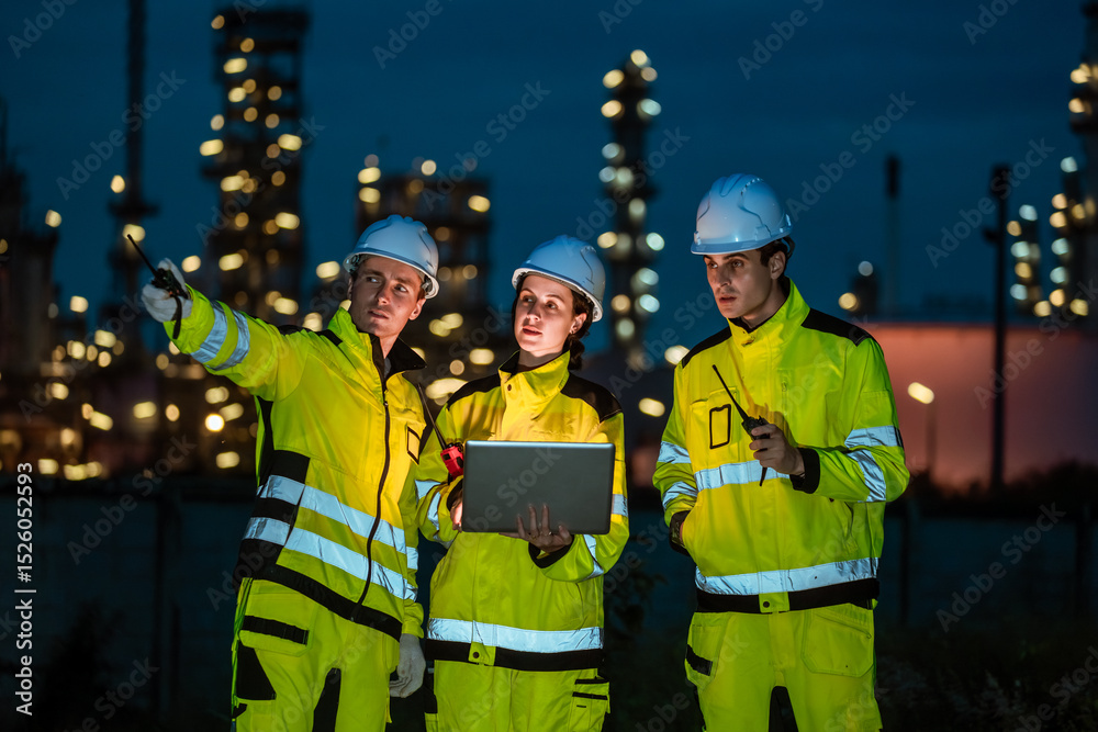 Industrial teamwork of engineer man and woman using a laptop computer during night shift at an oil refinery. Focused professionals working under factory lights.