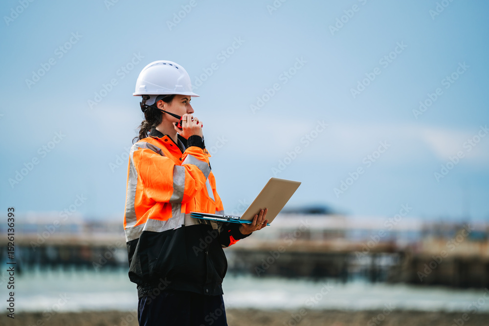 Female engineer, refinery inspector, and industrial worker conducting safety survey near oil plant by the sea, holding laptop and radio in industrial area
