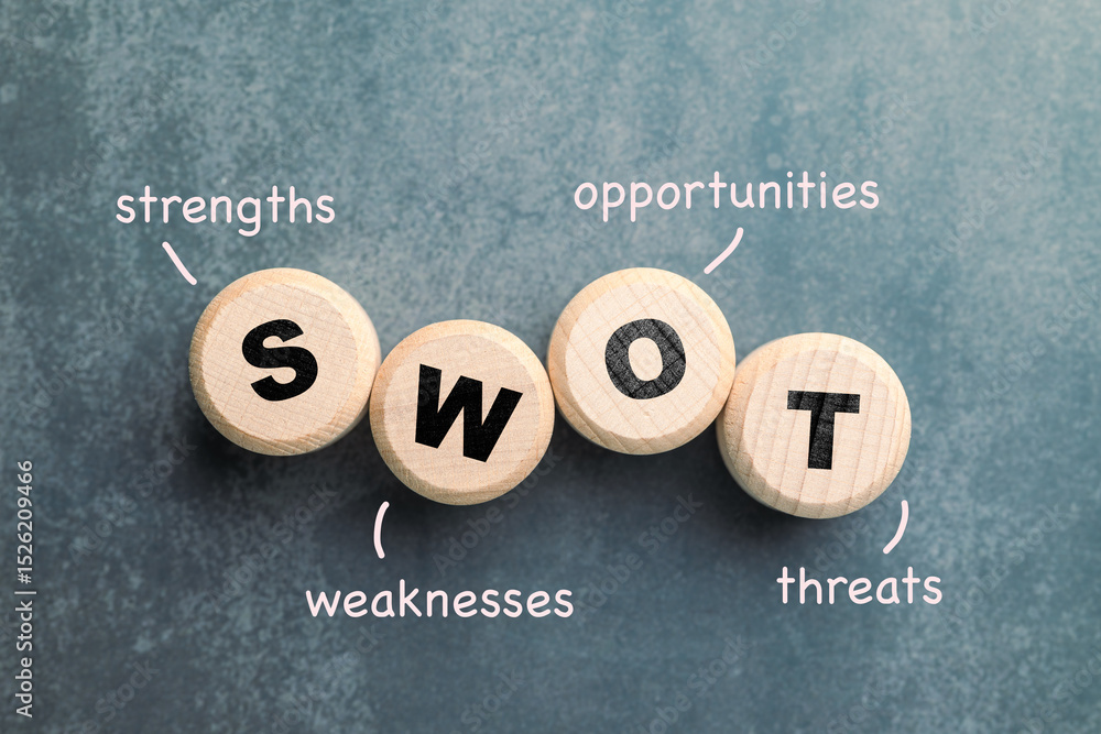 SWOT analysis represented by wooden blocks labeled with Strengths, Weaknesses, Opportunities, and Threats. Ideal for business strategy, planning, and decision-making visuals