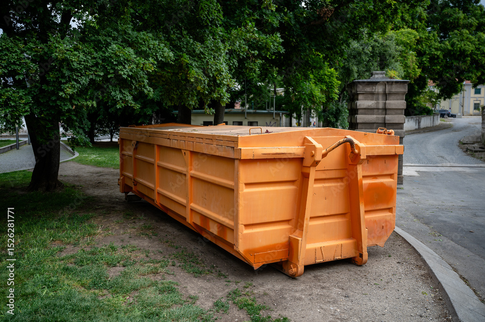 Large orange industrial dumpster placed under trees in urban park area outdoors