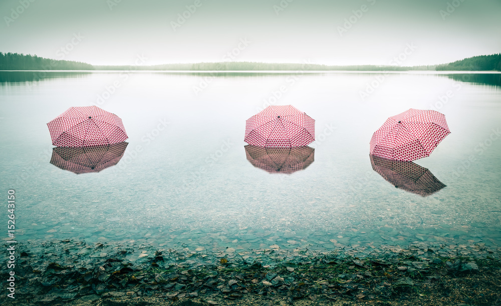 Tree pinky umbrellas in the lake landscape. This picture describes global warming.