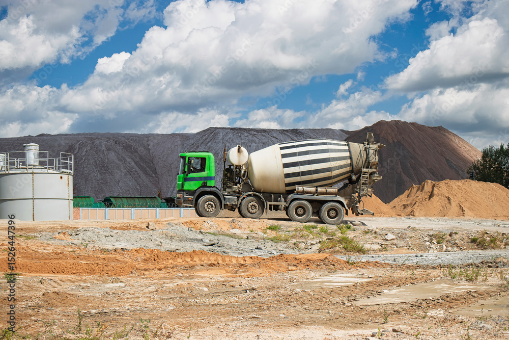Cement truck delivering fresh mix at construction site under a blue sky with clouds