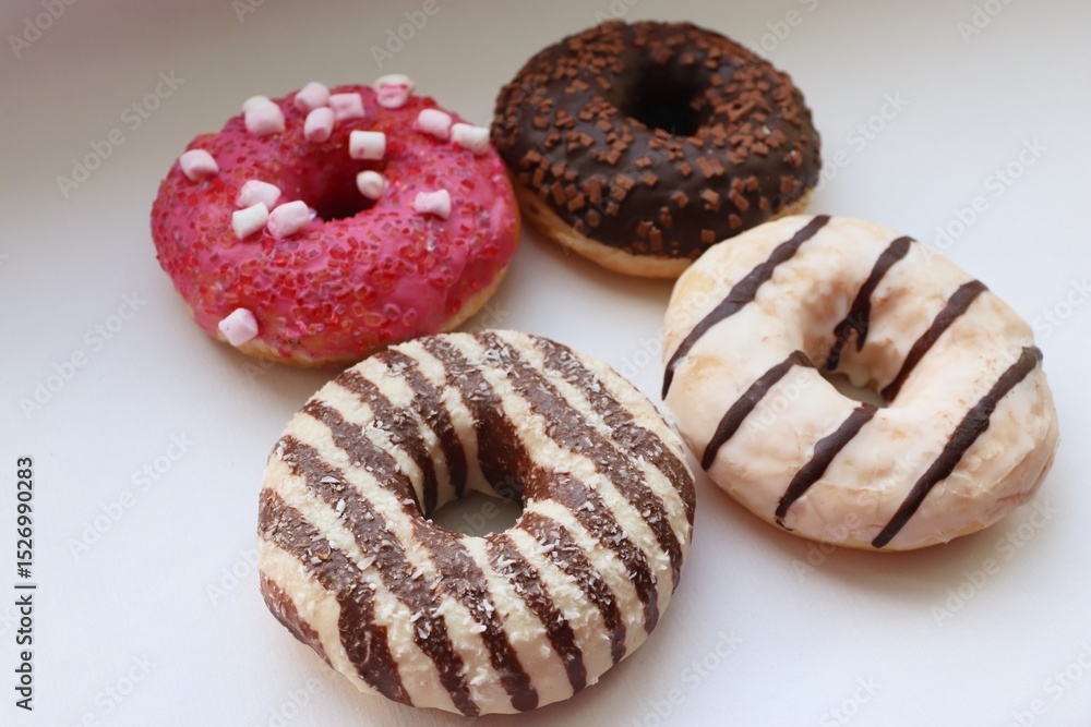 Top View of Four Colorful Donuts with Chocolate and Pink Glaze on White Surface – Confectionery Background