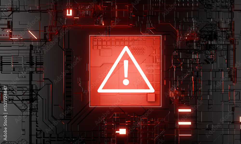 digital alert a close-up shot of a high-tech digital circuit board illuminated by a bright red warning sign, creating a sense of urgency and technological concern