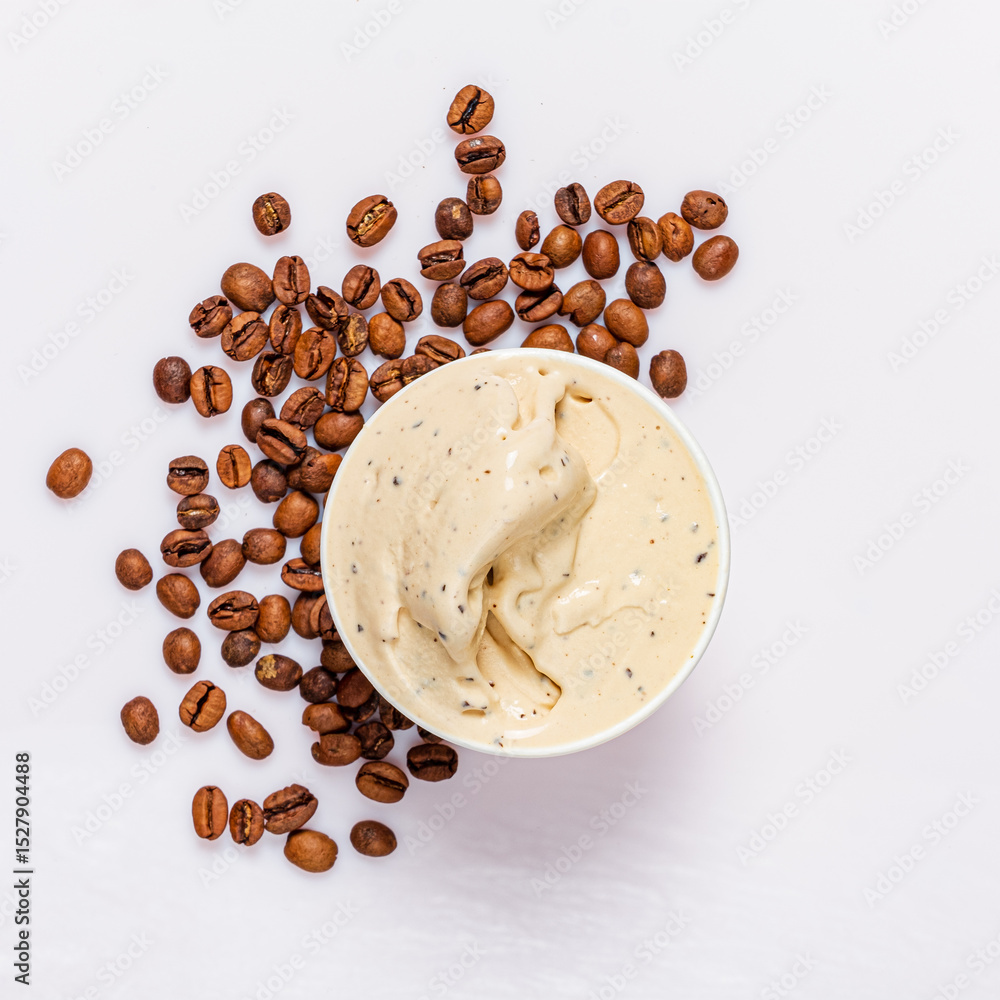Creamy ice cream atop roasted coffee beans creates a delightful dessert moment