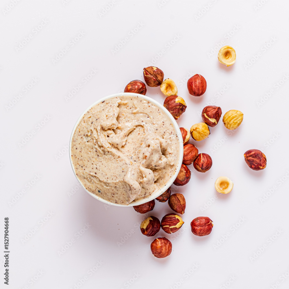 A creamy nut dessert sits in a bowl surrounded by colorful nuts, inviting taste and indulgence