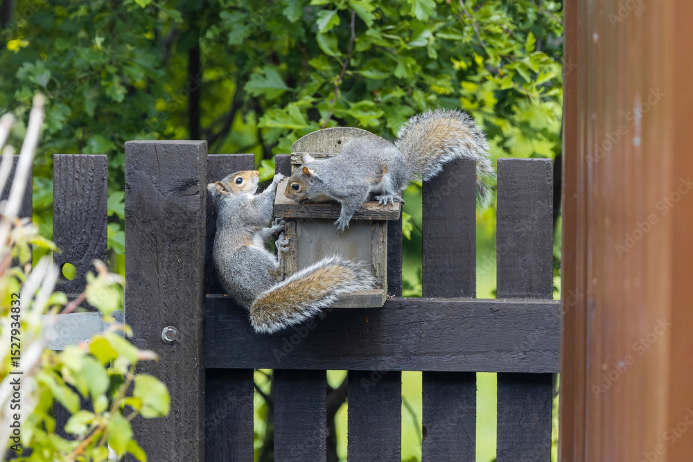 Two Playful Young Grey Squirrels Competing on Peanut Feeder in Garden