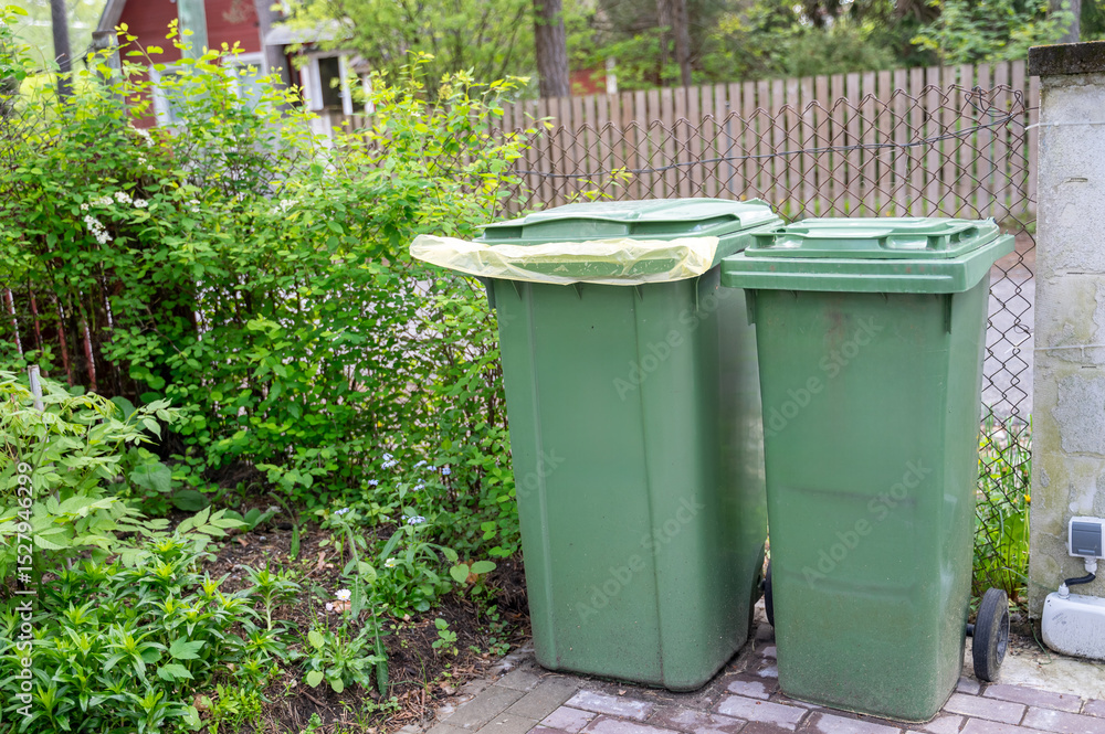 Two green plastic garbage bins stand near fence on private plot, one of them with yellow bag for collecting packaging