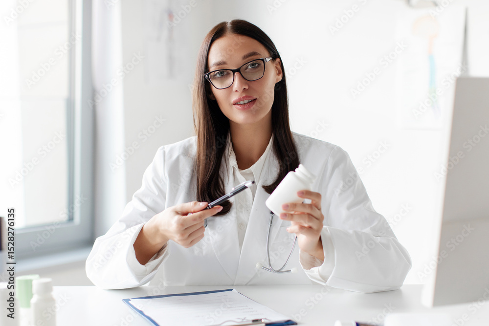 Young female doctor pharmacist recommending pills, showing jar, talking and consulting remotely from her office