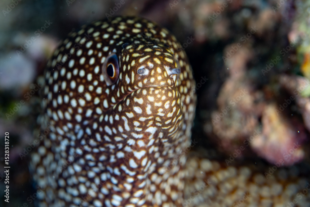 A White-mouth moray eel, Gymnothorax meleagris, slithers out of a hole on a coral reef in Wakatobi National Park, Indonesia. This beautiful eel is found throughout the Ind0-Pacific region.