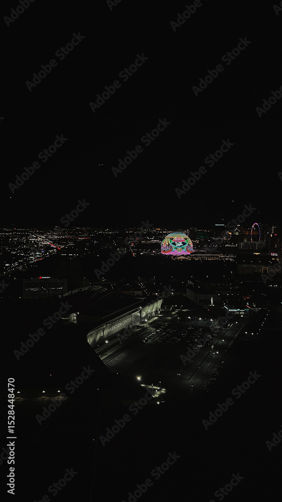 Las Vegas Strip and Convention Center at Night with Illuminated MSG Sphere and City Lights — Aerial View of Iconic Las Vegas Skyline Under Dark Sky, Vibrant Urban Travel and Night Photography