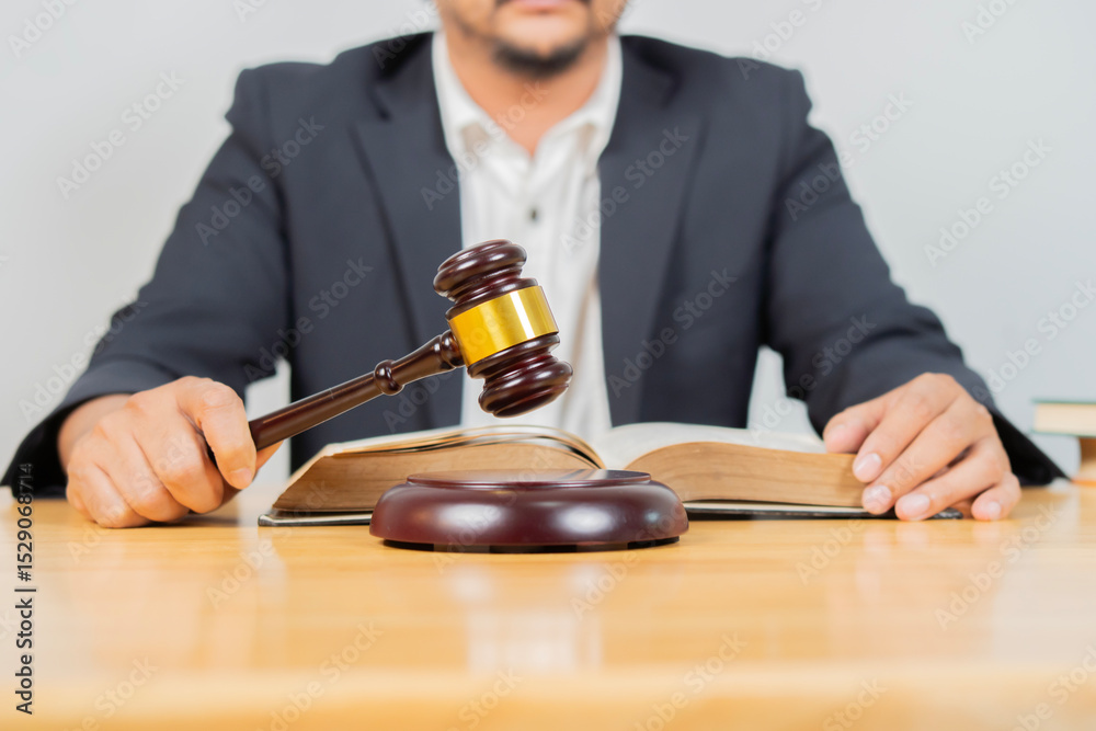 A lawyer with a gavel in hand and a book on the table in front of him in an office setting