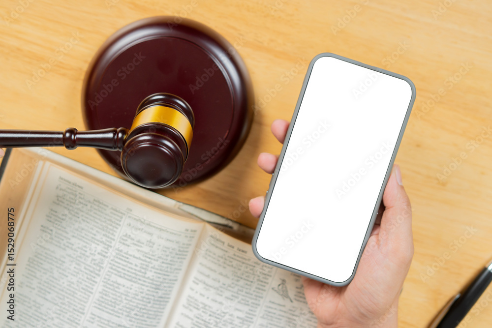 Hand holding a phone with isolate screen with wooden gavel and book on table