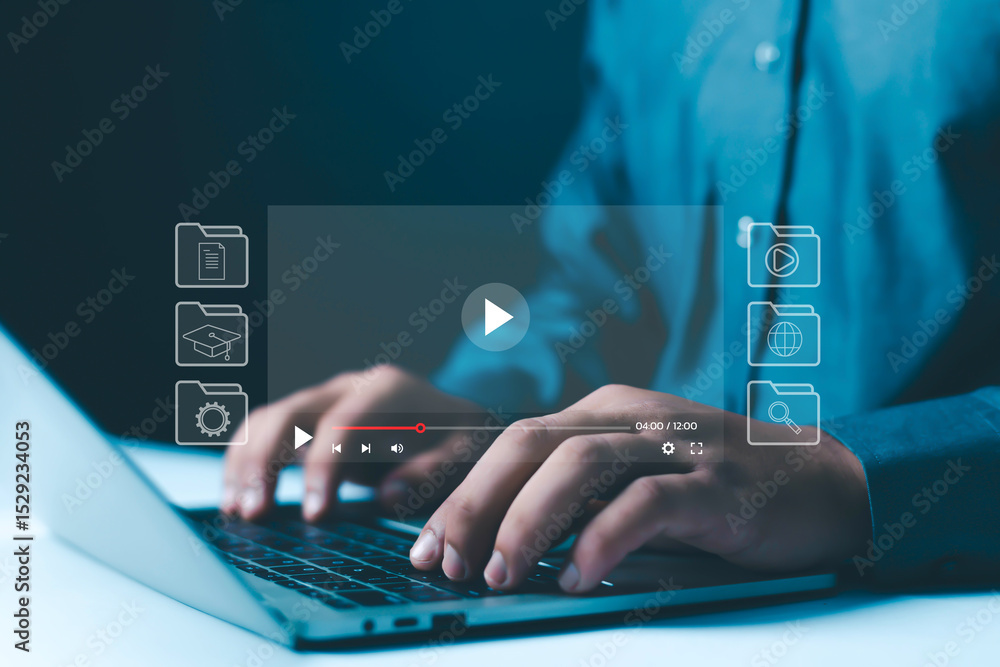 Businessmen watching the live streaming video Watch videos on the internet, live concerts, performances, or teachings. Stream on the internet online programs or lessons concept