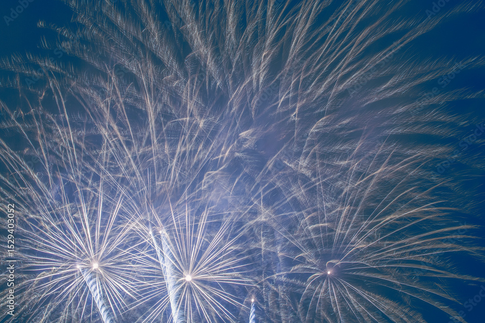 oliday card backdrop: multiple bright fireworks against blue night sky