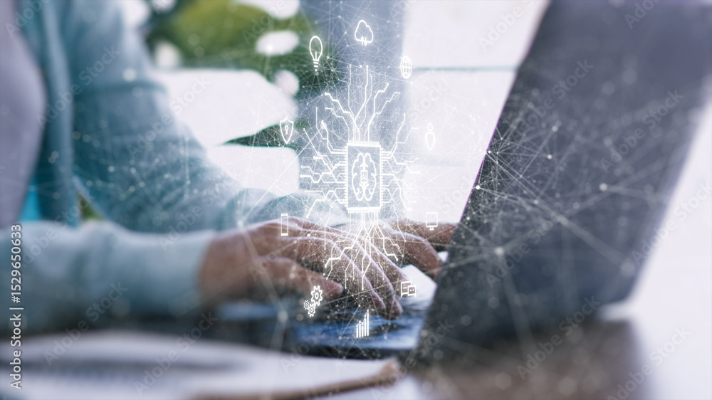 Artificial intelligence technology concept. A person using artificial intelligence technology in daily work, symbolizing the integration of AI into business and modern life.