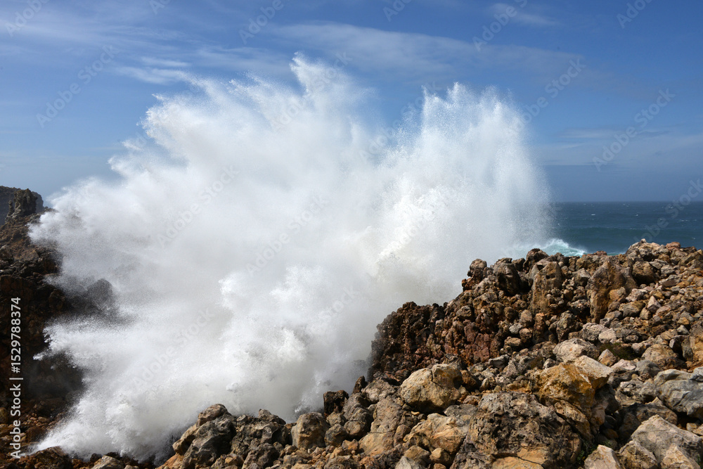 big waves breaking at a cliff in the western Algarve of Portugal