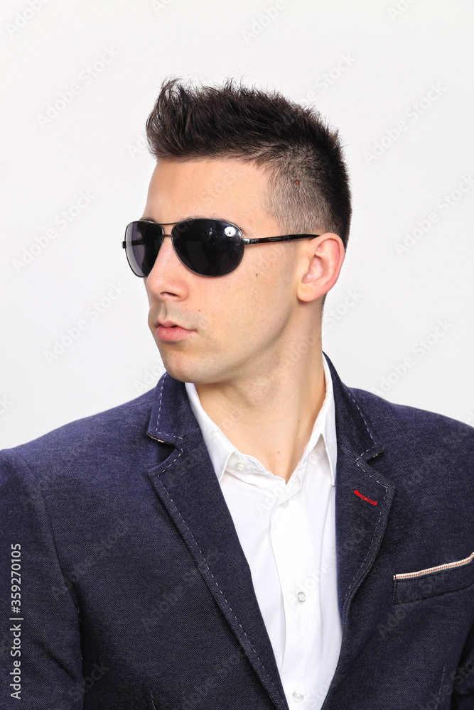Funny close-up of a weird bald man with a long gray beard and glasses making a funny face, half face. Concept of eccentricity, humor and expressive personality.