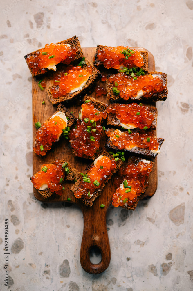 Close-up of dark rye toast bites topped with red caviar, butter and chives on wooden board