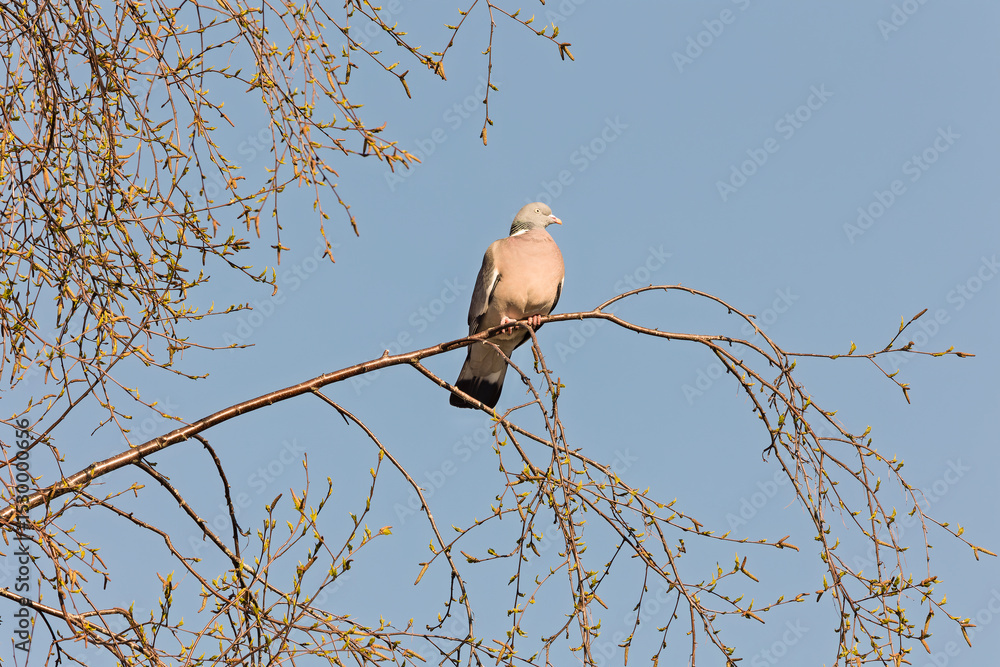 Wood Pigeon Perched on a Budding Spring Branch
