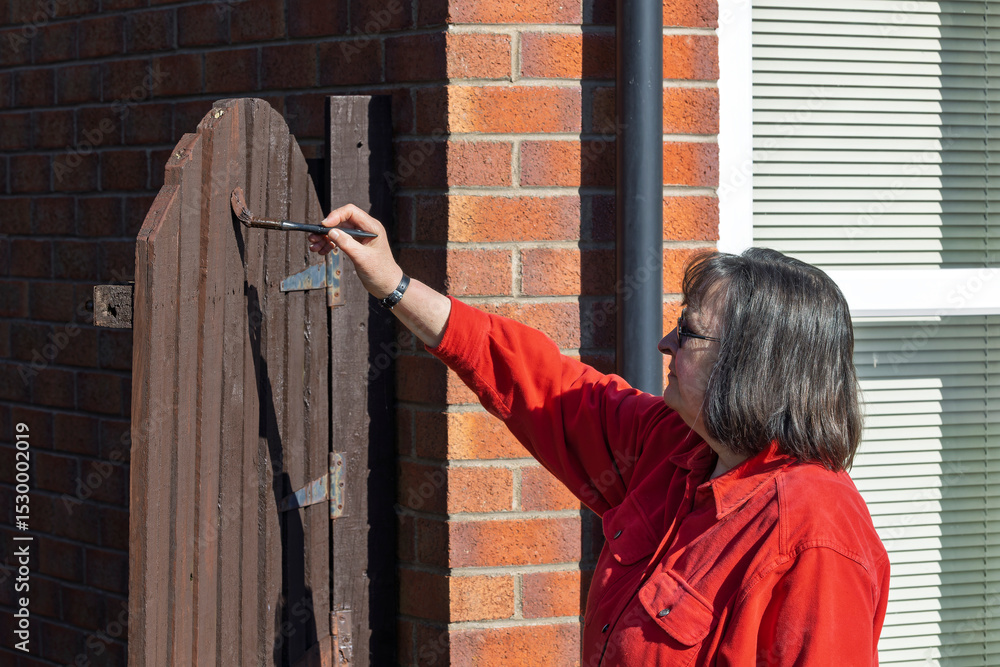 Woman Doing a DIY Home Improvement Project Painting Wooden Garden Gate
