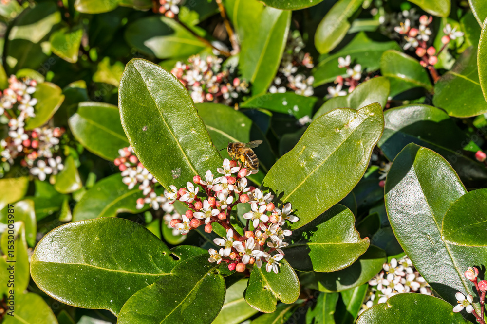 Busy honey bee collects pollen from white blossoms of Skimmia japonica shrub with evergreen leaves. The bee has yellow pollen in the pollen baskets on its legs