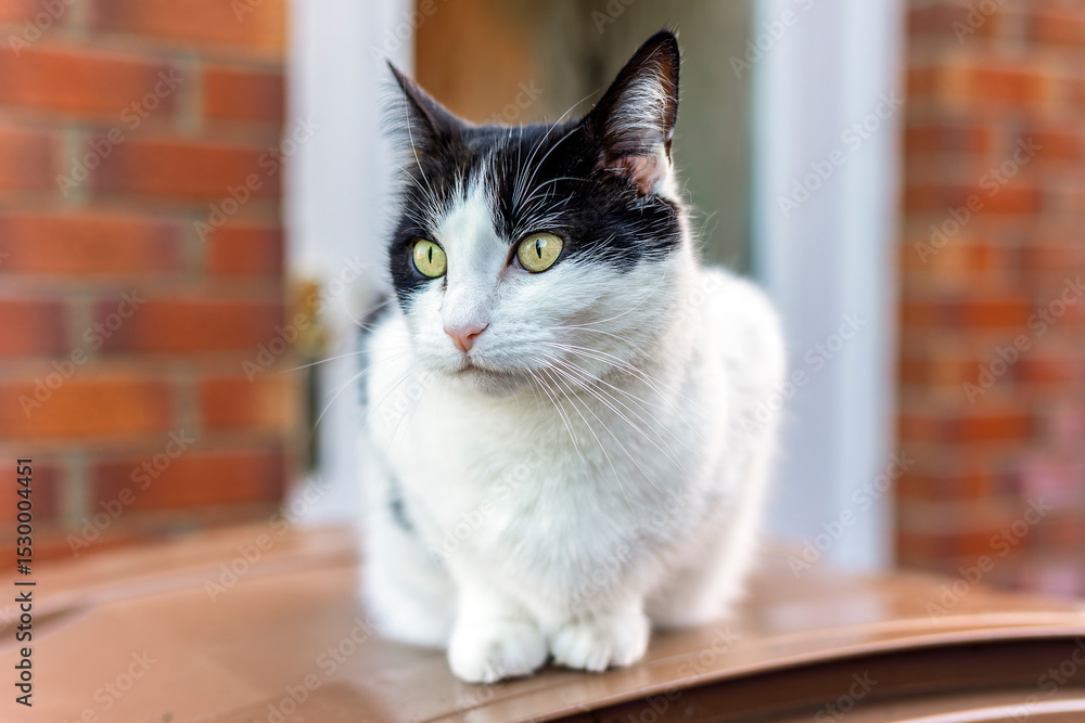 Black and white cat sitting on brown wheelie bin beside a house back door. Its alert gaze with yellow eyes and and neat paws embody the curious and observant nature of a domestic feline
