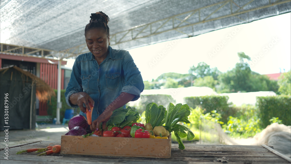 Portrait of woman with a tray of fruit and vegetable, enjoying a day of learning