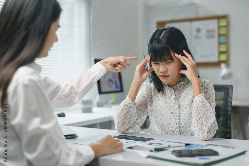 Asian businesswomen are stressed and having a headache with bad work results, manager blaming employee for mistakes in office