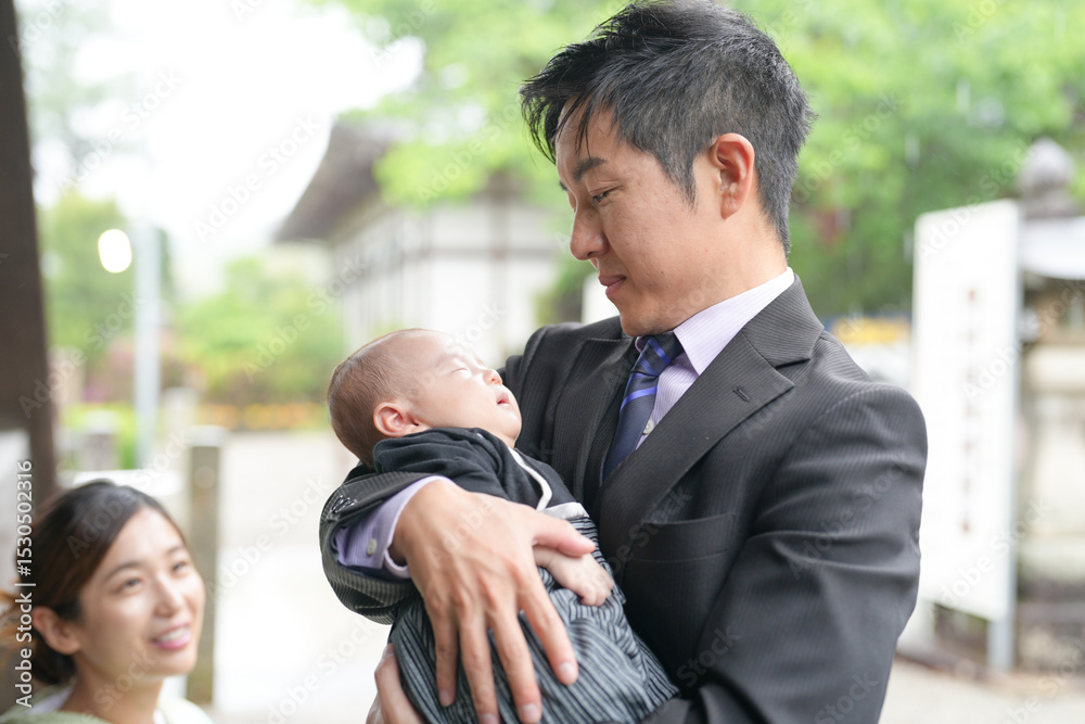 On a spring day in May at a Japanese temple, a one-month-old Japanese baby in hakama is held by a mother in kimono and a suited man, both in their twenties, sharing a precious family moment.