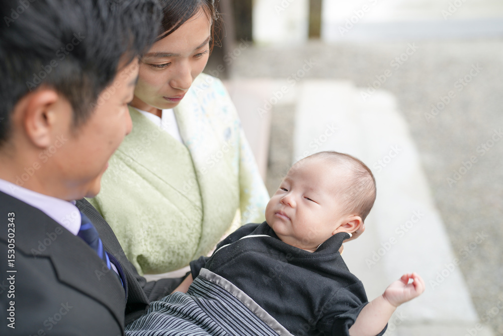 On a spring day in May at a Japanese temple, a one-month-old Japanese baby in hakama is held by a mother in kimono and a suited man, both in their twenties, sharing a precious family moment.