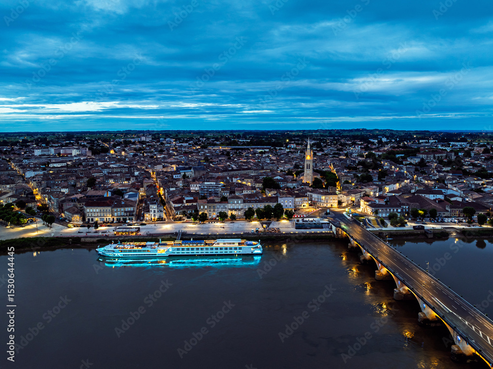 Night over Libourne from a drone, Gironde, Nouvelle-Aquitaine, Saint-Émilion and Pomerol, Southwestern France, Europe