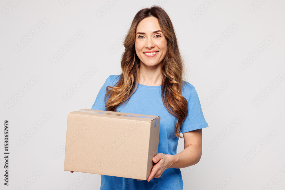 Young smiling happy cheerful Caucasian woman wears blue t-shirt casual clothes hold blank cardboard box look camera isolated on plain solid white color background studio portrait. Lifestyle concept.
