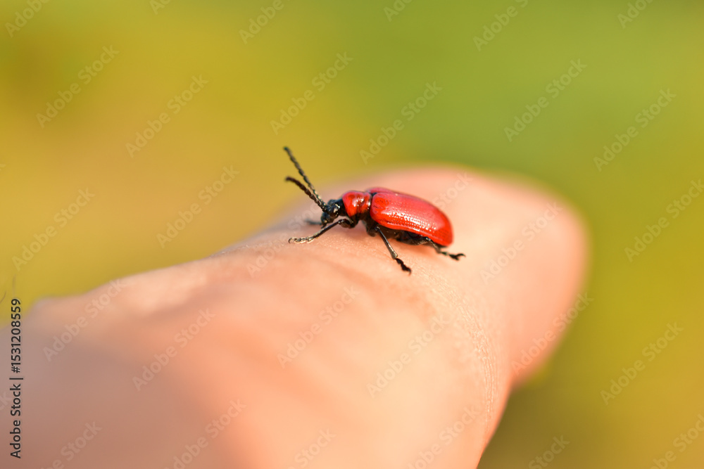 The lily beetle, an insect from the leaf beetle family, sits on a person's finger