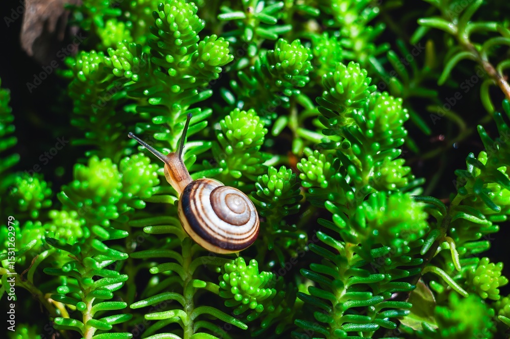 A snail gracefully moves across vibrant green succulent plants in a natural setting.