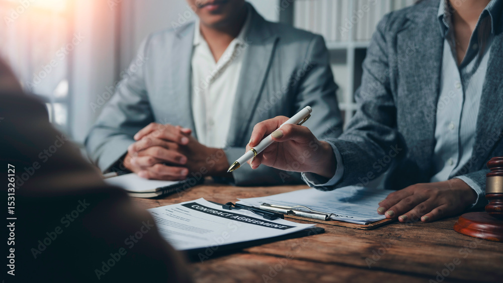 Business people and lawyers engaging in contract assessment discussions during a professional meeting in an office setting