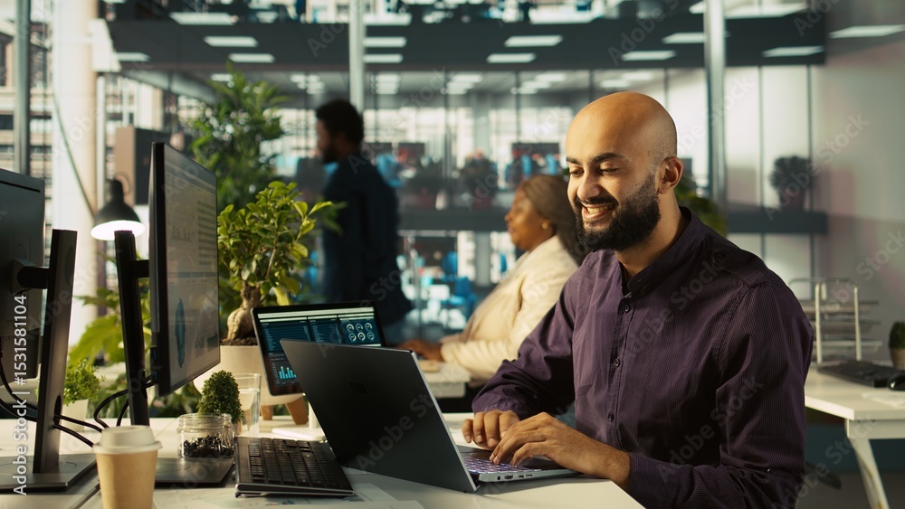 Happy man in office reviewing financial graphs, pleased after seeing good key performance indicators. Cheerful employee celebrating positive KPIs and data trends, camera B