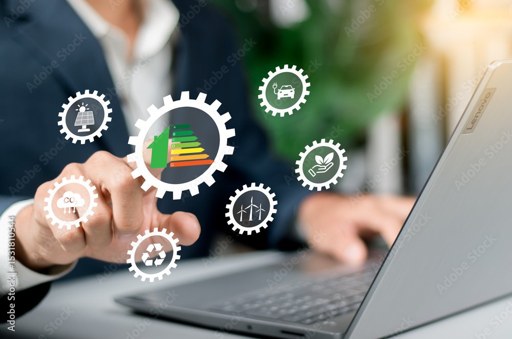Energy efficiency icons on laptop screen, green smart home hologram in front. Represents sustainable living and technology. Perfect for eco campaigns, energy conservation, and smart home tech.