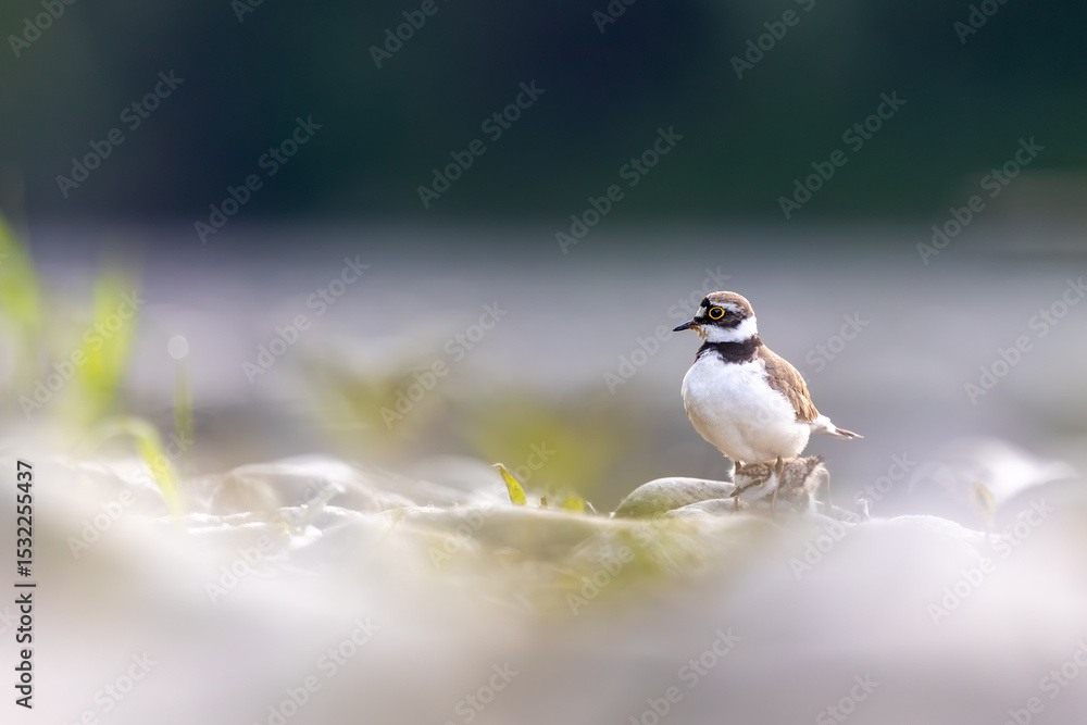 Portrait of a Little ringed plover female with a chicken, mom with descendant, Charadrius dubius, Slovakia, wildlife