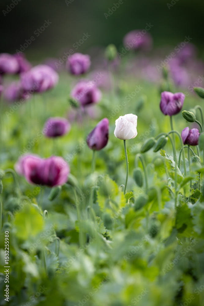 A blooming field of opium poppies, a white poppy flower stands out among the purple ones, Papaver somniferum, Slovakia.