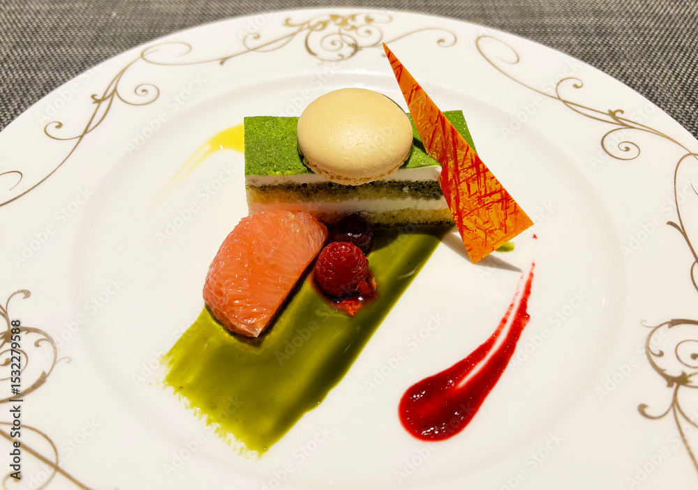 抹茶ケーキとマカロンとフルーツのデザート