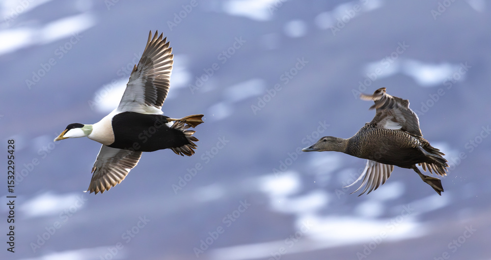 Flying common eiders, Svalbard, Norway