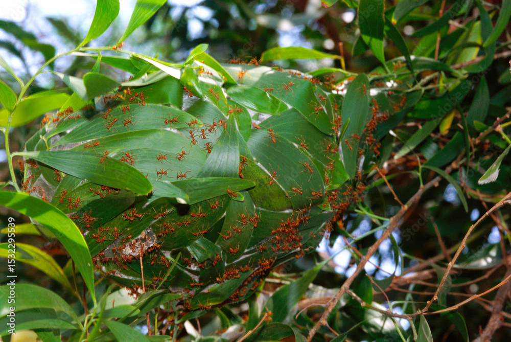Insects ants nest red tailor ants oecophyila smaragdine on green leaves
